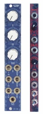 Attenumixer ist ein 3 kanaliger passiver Abschwächer mit einem Summenausgang für alle 3 Kanäle auf 4 TE. MiniAtt ist ein zweifacher summierender passiver Abschwächer mit Schaltern zum Ein- und Ausschalten von Kanälen. Beide Module sind hervorragend für CV, aber eigenen sich auch gut für Audio.